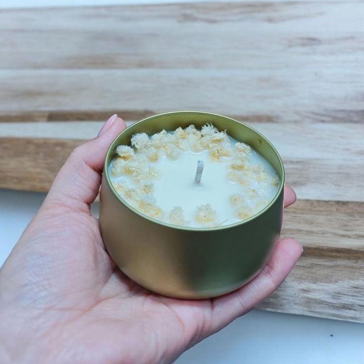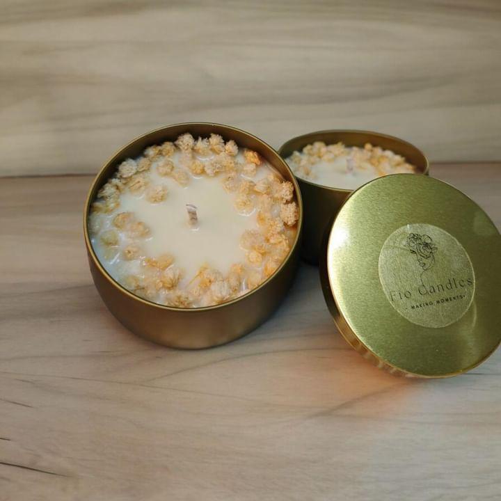 Vela aromática de cera de soja.Recipiente dorado 200gr / 16hs de uso.
