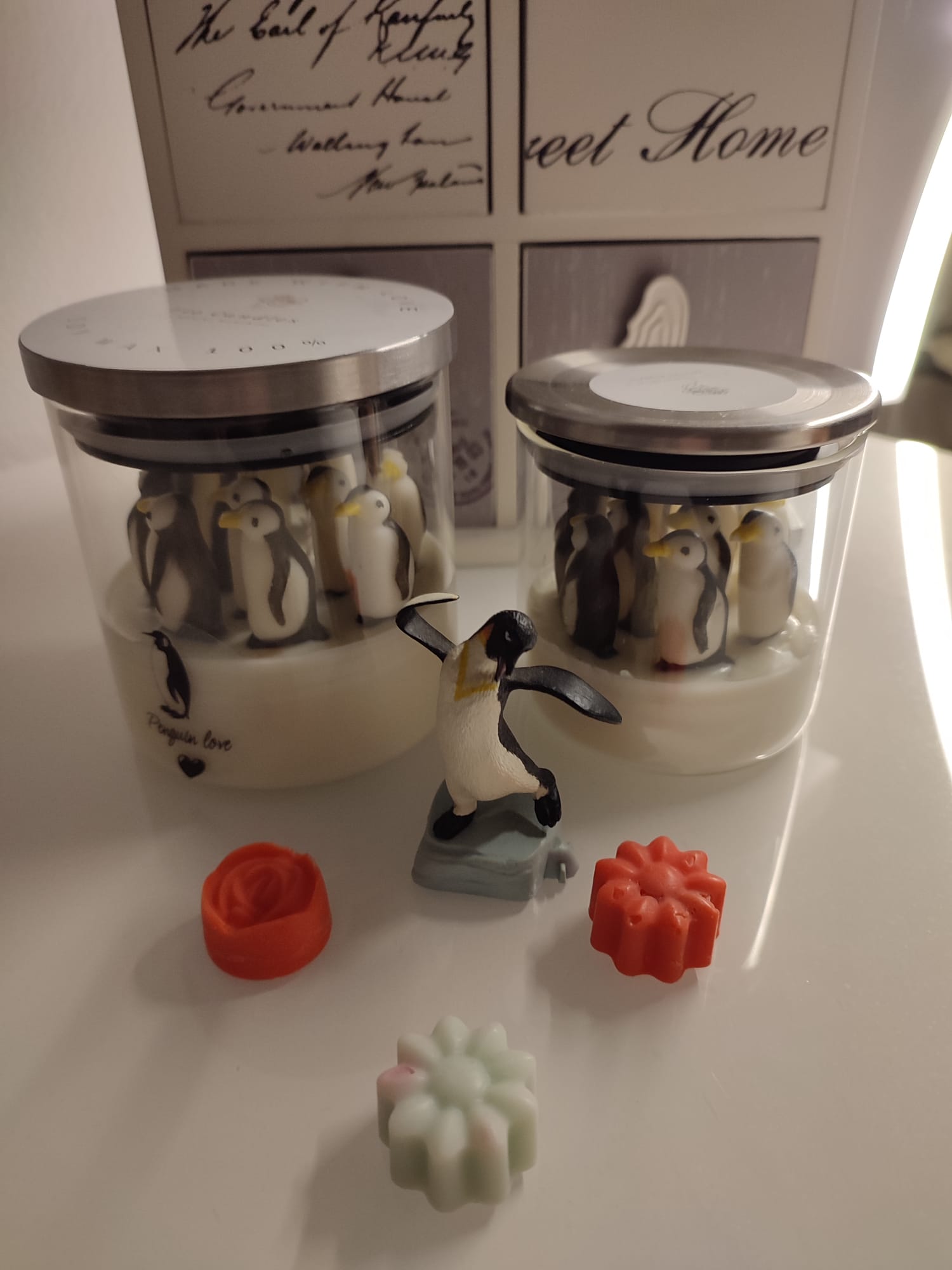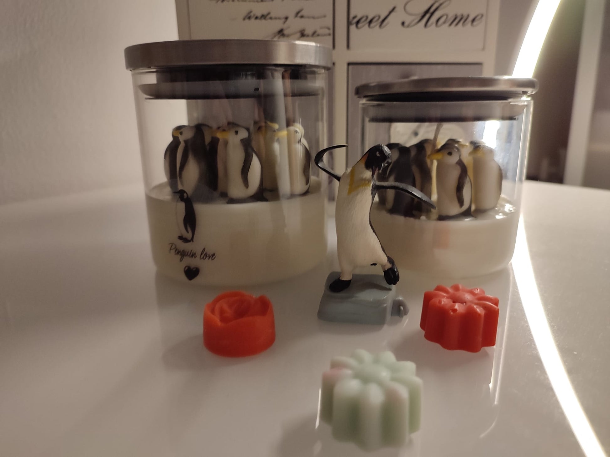 Vela de cera de soja en recipiente de cristal con motivo de pingüinos pintados a mano, aroma a elegir entre Lavanda, coco,cedro y jazmín, jazmín andaluz, mandarinas. Incluye mensaje oculto una vez derrite la primera capa de cera (mensaje personalizado)